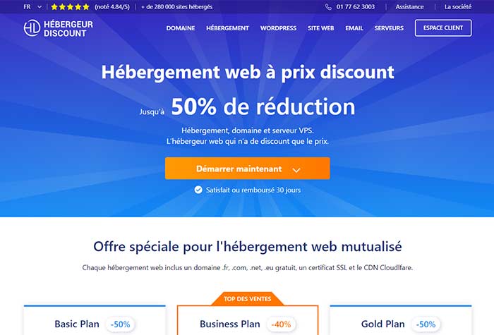 Hébergeur Discount est un professionnel très réputé en raison de ses frais d’abonnement d’hébergement qui sont bas et les plus abordables du marché. Actuellement, cette société française propose même une réduction de 50 % sur tous ses services. Par exemple, il est possible aujourd’hui de bénéficier d’un abonnement de qualité avec 1 euro par mois. À noter que vous n’avez besoin d’aucun code promo pour avoir accès à aux offres proposées par l’entreprise. En effet, l’avantage de cette promotion réside dans le fait que vous disposez de la garantie satisfait ou remboursé. Il est donc important de saisir l’occasion pour souscrire à l’une des offres proposées par votre Hébergeur Discount.