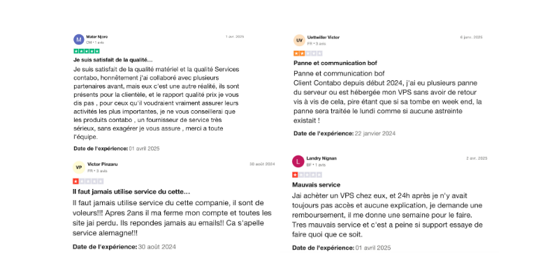 Sur Trustpilot, Contabo obtient une note moyenne de 3,9/5 sur plus de 6 000 avis. Les retours sont très polarisés : nombreux 5 étoiles saluant la puissance à bas prix, mais aussi de nombreux 1 étoile dénonçant le support ou les suspensions de compte en cas de surcharge CPU prolongée. Sur les forums spécialisés et Reddit, les discussions confirment cette dualité : Contabo est recommandé pour les utilisateurs avancés, mais souvent déconseillé aux débutants.