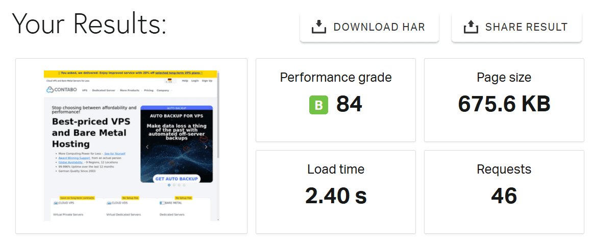 Pour mesurer la performance de Contabo, nous avons déployé un site WordPress standard (thème Astra + contenu de démonstration) sur un VPS “Cloud VPS S” avec 4 vCPU, 8 Go de RAM et stockage NVMe, localisé dans le datacenter de Nuremberg. Les tests de vitesse ont été réalisés avec GTmetrix, PageSpeed Insights et Pingdom Tools, sans cache externe ni optimisation manuelle, afin d’évaluer les performances brutes.
