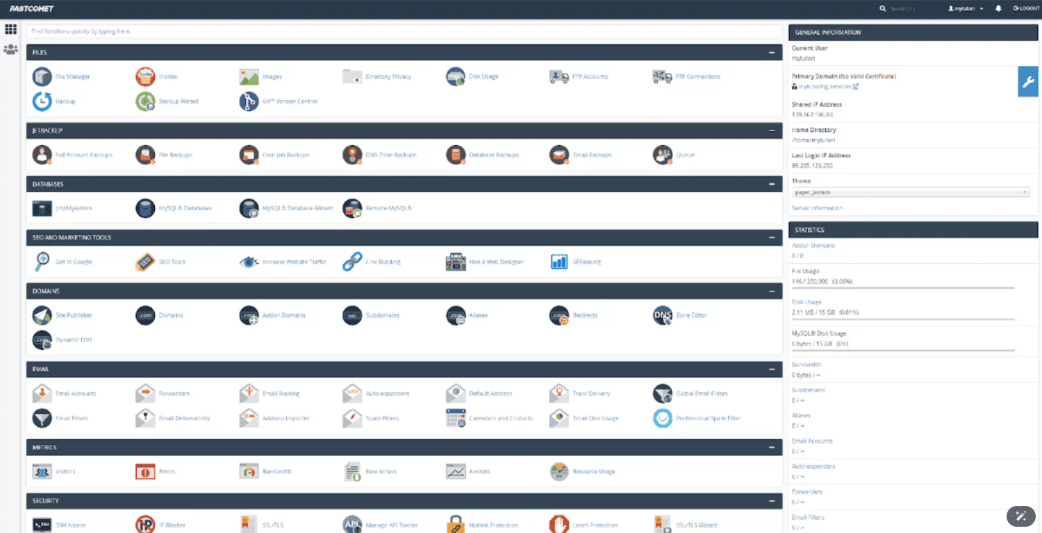 L’interface utilisateur proposée par FastComet repose sur une combinaison entre le panneau de gestion classique cPanel et une interface client propriétaire développée par l’hébergeur. Dès la connexion, l’espace client donne accès à un tableau de bord clair, permettant de gérer ses services, domaines, factures et tickets de support.