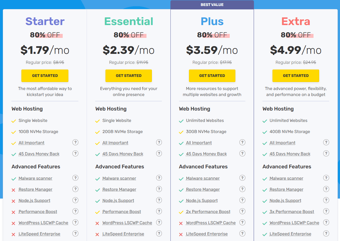 FastComet affiche des tarifs d’entrée parmi les plus compétitifs du marché, avec une formule de base à partir de 2,19 € par mois pour un engagement de 36 mois. À ce prix, l’utilisateur bénéficie d’un hébergement SSD, d’un nom de domaine offert la première année, du cPanel, d’un certificat SSL, de sauvegardes automatiques et du CDN Cloudflare préinstallé. L’offre reste complète, même à ce niveau tarifaire, ce qui la rend très attractive pour les petits sites, blogs ou projets personnels.