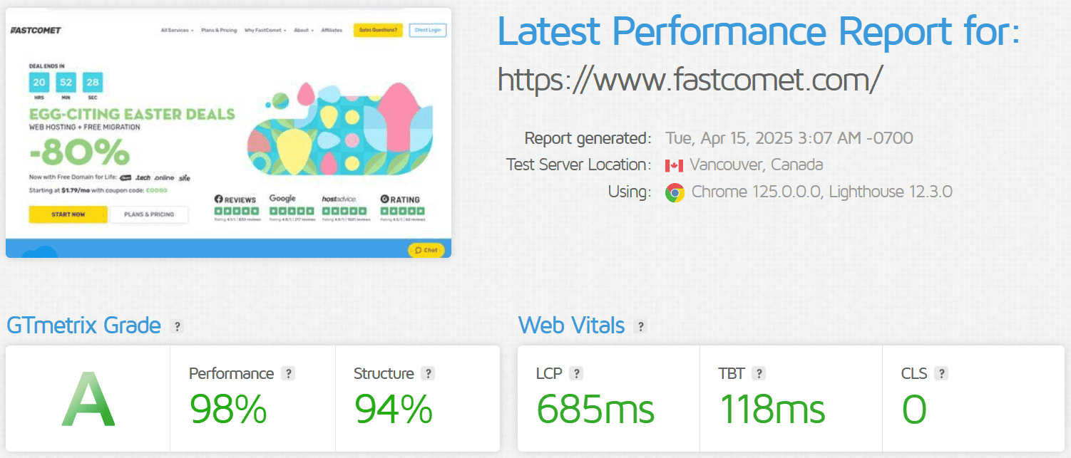 Pour évaluer la rapidité des serveurs FastComet, nous avons mené plusieurs tests à l’aide des outils GTMetrix, Google PageSpeed Insights et Pingdom Tools. Le site testé était un WordPress basique avec un thème léger, hébergé sur un serveur localisé en Allemagne (choisi dans le tableau de bord FastComet au moment de l’inscription).