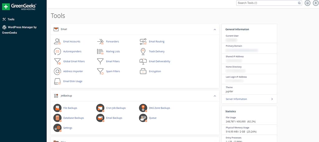 Pour la gestion fine de l’hébergement, GreenGeeks utilise le panneau de contrôle cPanel, l’un des plus répandus dans l’industrie. Cet environnement donne accès à une multitude de fonctionnalités : gestion des fichiers, bases de données, certificats SSL, sous-domaines, statistiques d’utilisation, et bien plus encore. Le cPanel est également personnalisable, avec la possibilité de masquer certaines fonctions ou de créer des raccourcis selon ses préférences. Grâce à sa stabilité et à sa compatibilité avec un grand nombre d’applications, cPanel reste une référence rassurante pour les développeurs comme pour les utilisateurs avancés.