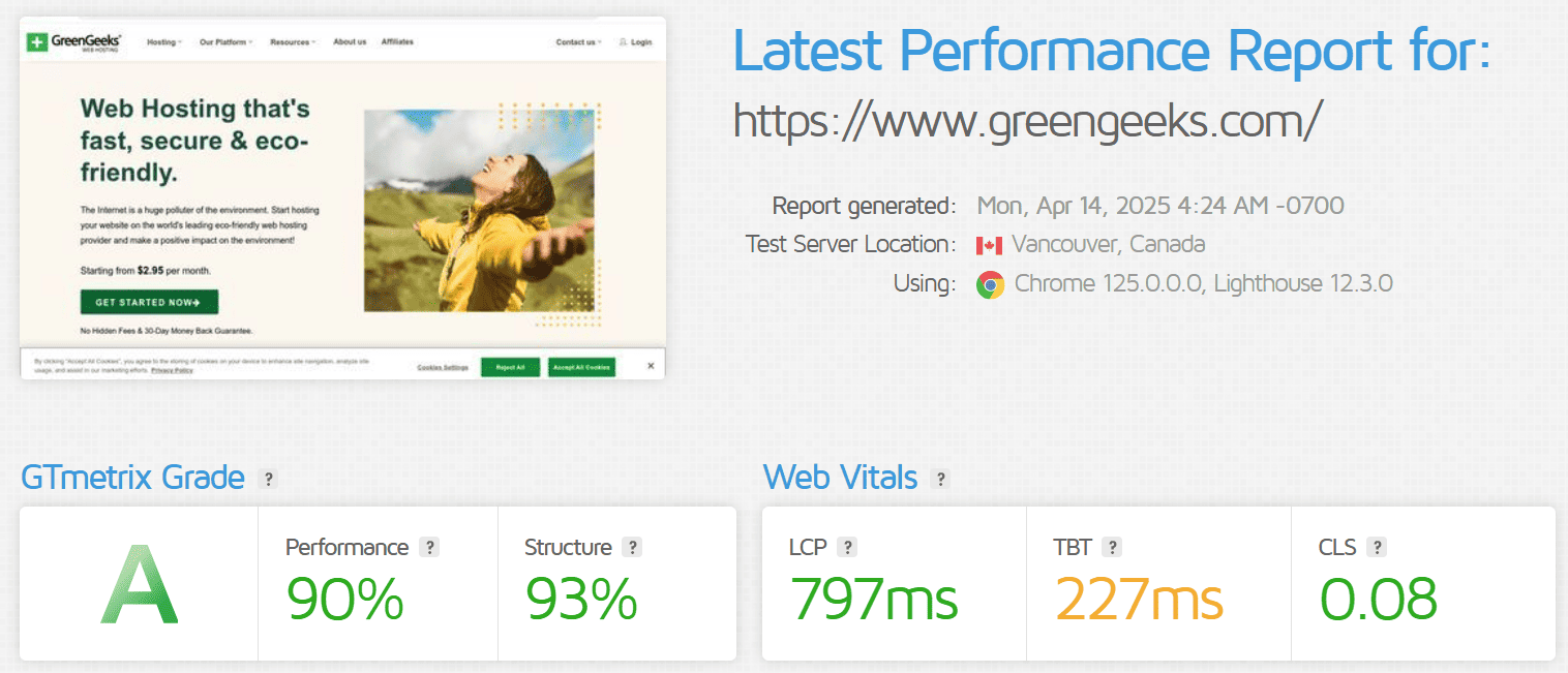Les tests réalisés avec GTMetrix sur un site WordPress standard hébergé chez GreenGeeks révèlent un temps moyen de chargement inférieur à 1 seconde pour la page d’accueil (test depuis la côte Est des États-Unis), ce qui le place parmi les meilleurs résultats observés dans sa gamme tarifaire. Sur PageSpeed Insights, les scores atteignent régulièrement 90 à 95 sur 100 en version mobile, grâce à l’optimisation des ressources serveurs, à la compression GZIP, et à la mise en cache serveur.