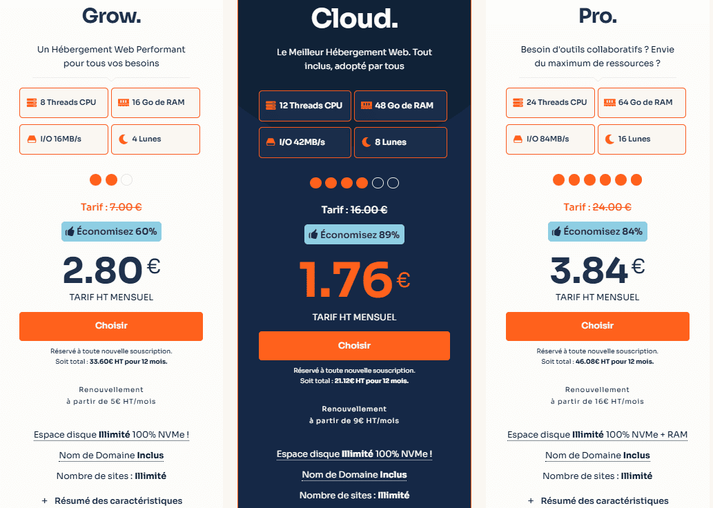 Oui, mais seulement à court terme. Les prix affichés (ex. 2,49 €/mois) sont valables pour des engagements très longs (jusqu’à 48 mois). Au renouvellement, les tarifs augmentent fortement. O2Switch, avec un prix fixe de 7 € HT/mois sans engagement, reste plus transparent sur le long terme.