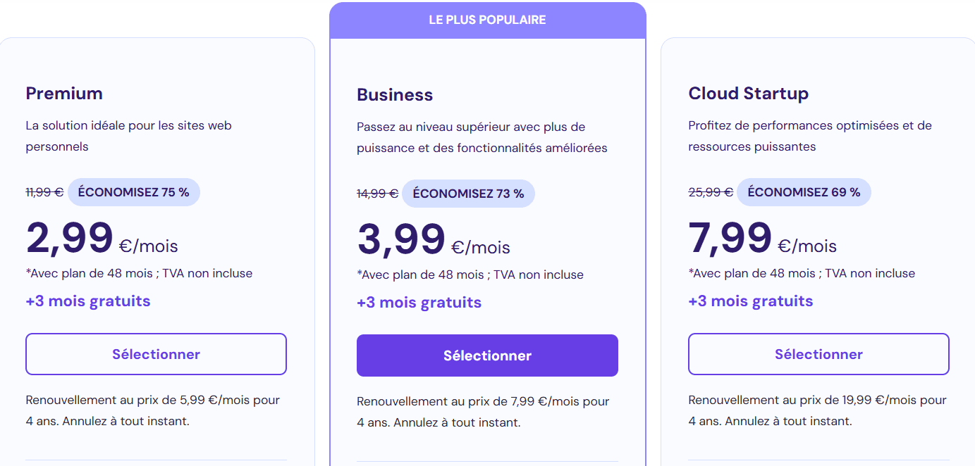 Du côté de Hostinger, l’offre est construite autour de trois plans mutualisés : Single, Premium et Business. Le plan d’entrée de gamme, Single, démarre à 1,49 € par mois, mais nécessite un engagement de 48 mois pour profiter de ce tarif. Il inclut 50 Go de stockage, une adresse e-mail et un certificat SSL, mais ne propose pas de nom de domaine gratuit. Le plan Premium, à 2,99 €/mois, ajoute un nom de domaine gratuit pendant un an, augmente le nombre de sites hébergeables et monte à 100 Go de stockage. Enfin, le plan Business, à 3,99 €/mois, pousse les performances avec 200 Go de stockage, des sauvegardes quotidiennes et davantage de ressources serveur. En revanche, à l’issue de la période promotionnelle, les prix peuvent quasiment tripler, atteignant jusqu’à 10,99 €/mois selon le plan. Tous les plans incluent l’installation de WordPress en un clic, un tableau de bord maison particulièrement ergonomique, et des sauvegardes automatiques hebdomadaires ou journalières selon l’offre.