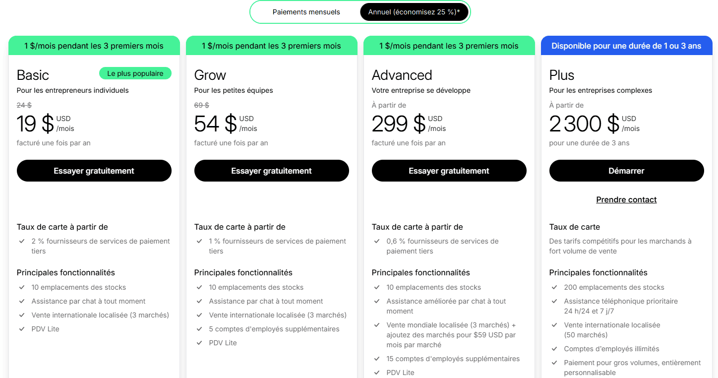Le plan Advanced Shopify, à 299 $/mois, est destiné aux grandes entreprises, offrant une personnalisation des frais de livraison par région, des rapports avancés et jusqu’à 15 comptes pour le personnel. Enfin, pour les grandes entreprises nécessitant des fonctionnalités sur mesure, Shopify Plus propose une solution personnalisée avec un tarif négociable, une assistance prioritaire et une infrastructure scalable.