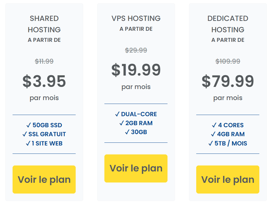 Le prix d’appel de JustHost démarre à 3,95 dollars par mois pour la formule Basic, à condition de s’engager pour 36 mois. Les offres Plus et Choice Plus sont proposées à partir de 6,95 dollars par mois, tandis que l’offre Pro est accessible à 13,95 dollars par mois. Attention, les tarifs augmentent significativement après la première période contractuelle.