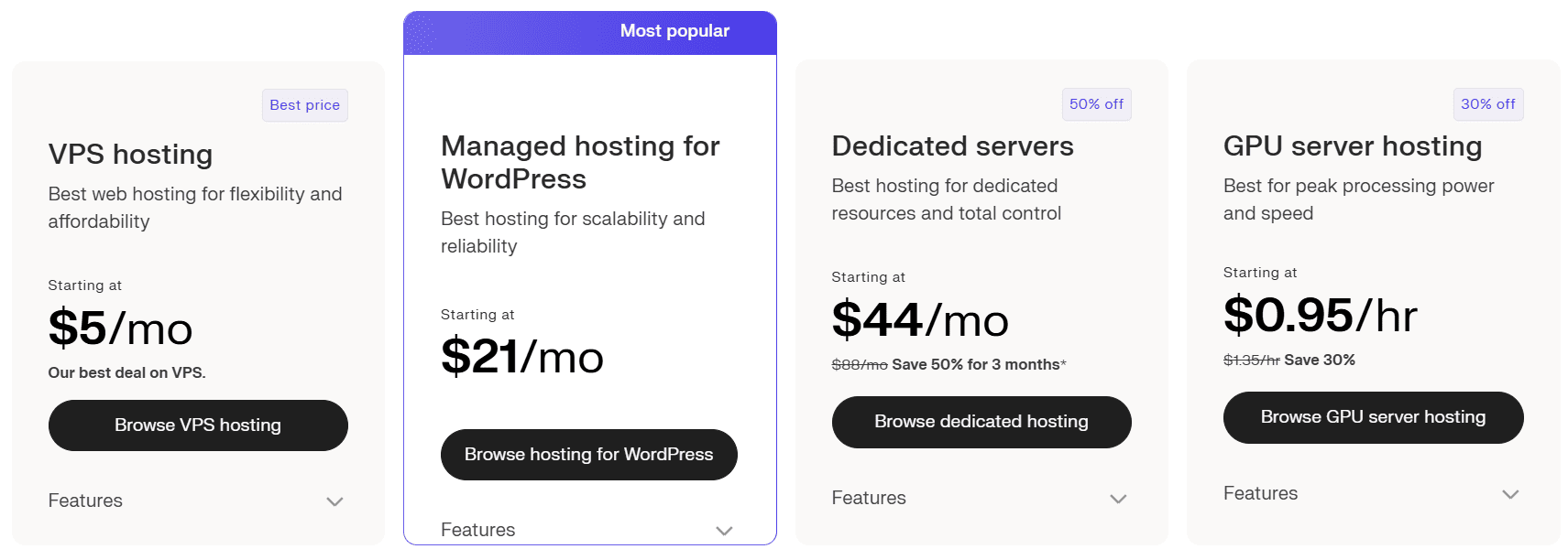 Hébergement VPS : Les plans VPS gérés commencent à partir de 20 $ par mois, offrant des ressources telles que 2 vCPU, 40 Go de stockage SSD et 10 To de bande passante. Des configurations supérieures sont disponibles, avec des prix augmentant en conséquence. Il est important de noter que les tarifs promotionnels peuvent s’appliquer pour les nouveaux clients, mais les renouvellements se font généralement au tarif standard.