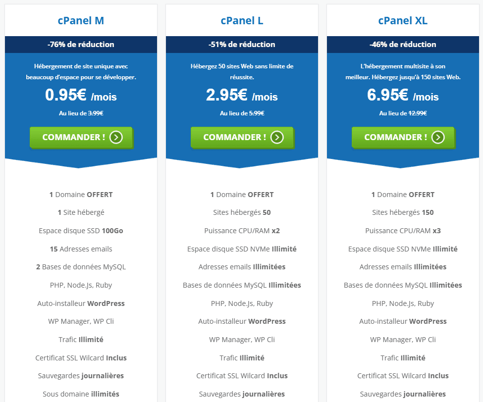L’entrée de gamme, baptisée « Start », est proposée à partir de 1,50 € TTC/mois en promotion (au lieu de 2,99 €). Elle offre 100 Go d’espace disque, un nom de domaine gratuit la première année, et une adresse email incluse. Elle est idéale pour un site vitrine, un blog personnel ou un portfolio simple.