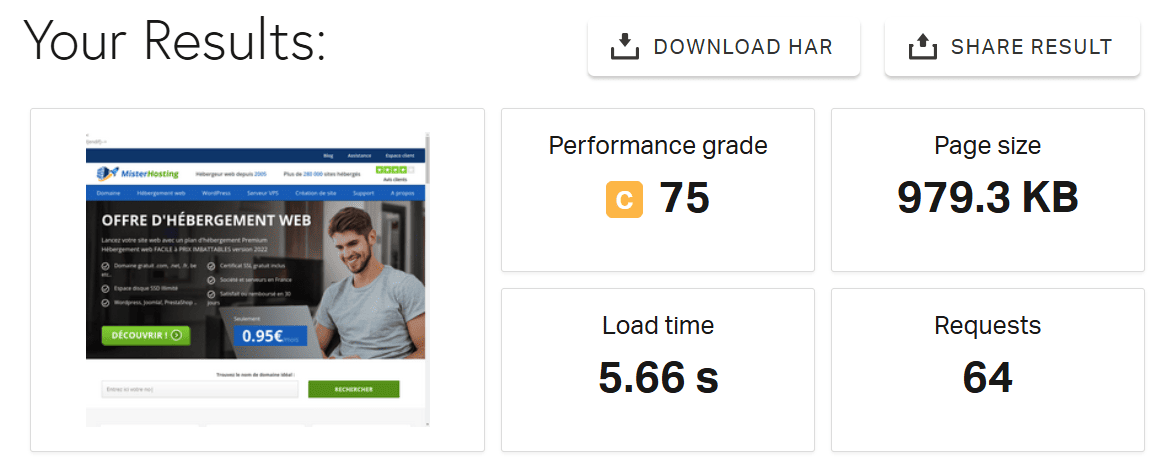 Pour évaluer la réactivité des serveurs de Mister Hosting, nous avons effectué plusieurs tests à l’aide des outils GTMetrix, PageSpeed Insights et Pingdom Tools, sur un site WordPress standard (thème léger + quelques plugins courants). Les résultats, sans optimisations particulières côté utilisateur, ont montré des performances honorables.