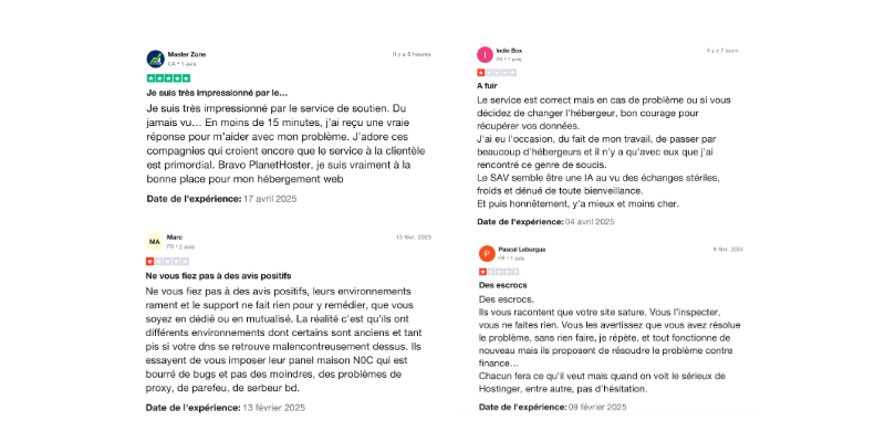 PlanetHoster bénéficie d’une réputation globalement très positive sur les principales plateformes d’avis, notamment Trustpilot, Google Reviews et Avis Vérifiés. La note moyenne oscille entre 4,4 et 4,7/5, ce qui est un excellent score pour un hébergeur web. La majorité des utilisateurs mettent en avant la stabilité du service, la qualité du support client, et la richesse fonctionnelle de l’offre « The World ».