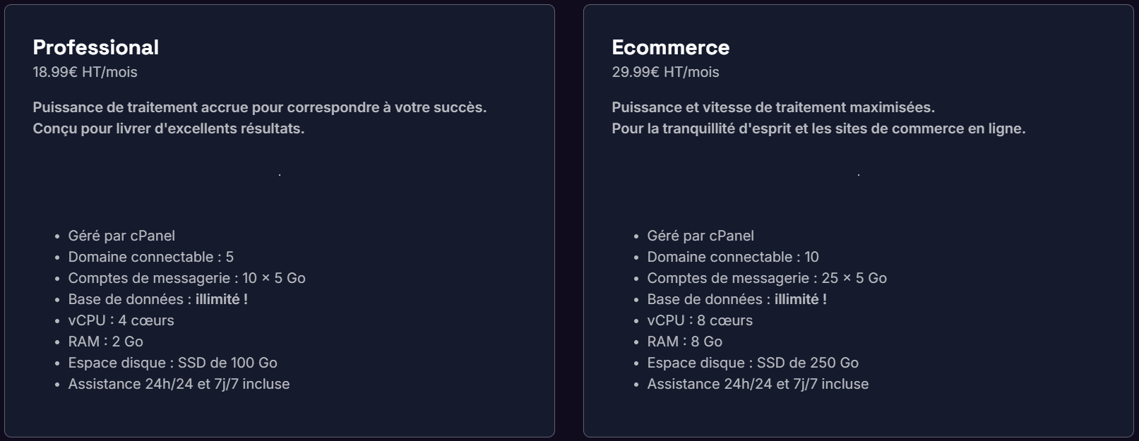 Côté VPS, OVH propose des machines virtuelles dès 4,20 € HT/mois, avec 1 vCore, 2 Go de RAM, 20 Go de stockage SSD, et une bande passante de 100 Mbps, le tout sans engagement. C’est l’un des meilleurs rapports prix/puissance du marché, mais l’interface peut s’avérer un peu austère pour les non-initiés.