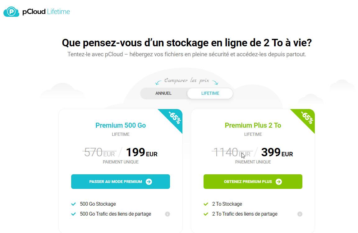 - pCloud propose des offres à vie, permettant un investissement à long terme sans souci de renouvellement annuel.